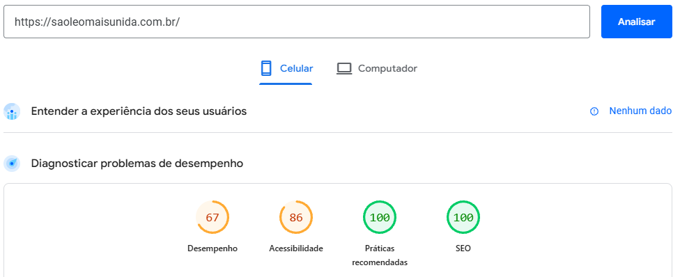 Os testes foram realizados na data de 24/11 na plataforma Google for Developer simulando a utilização de sistemas para celulares, os mais utilizados no momento, no Brasil.